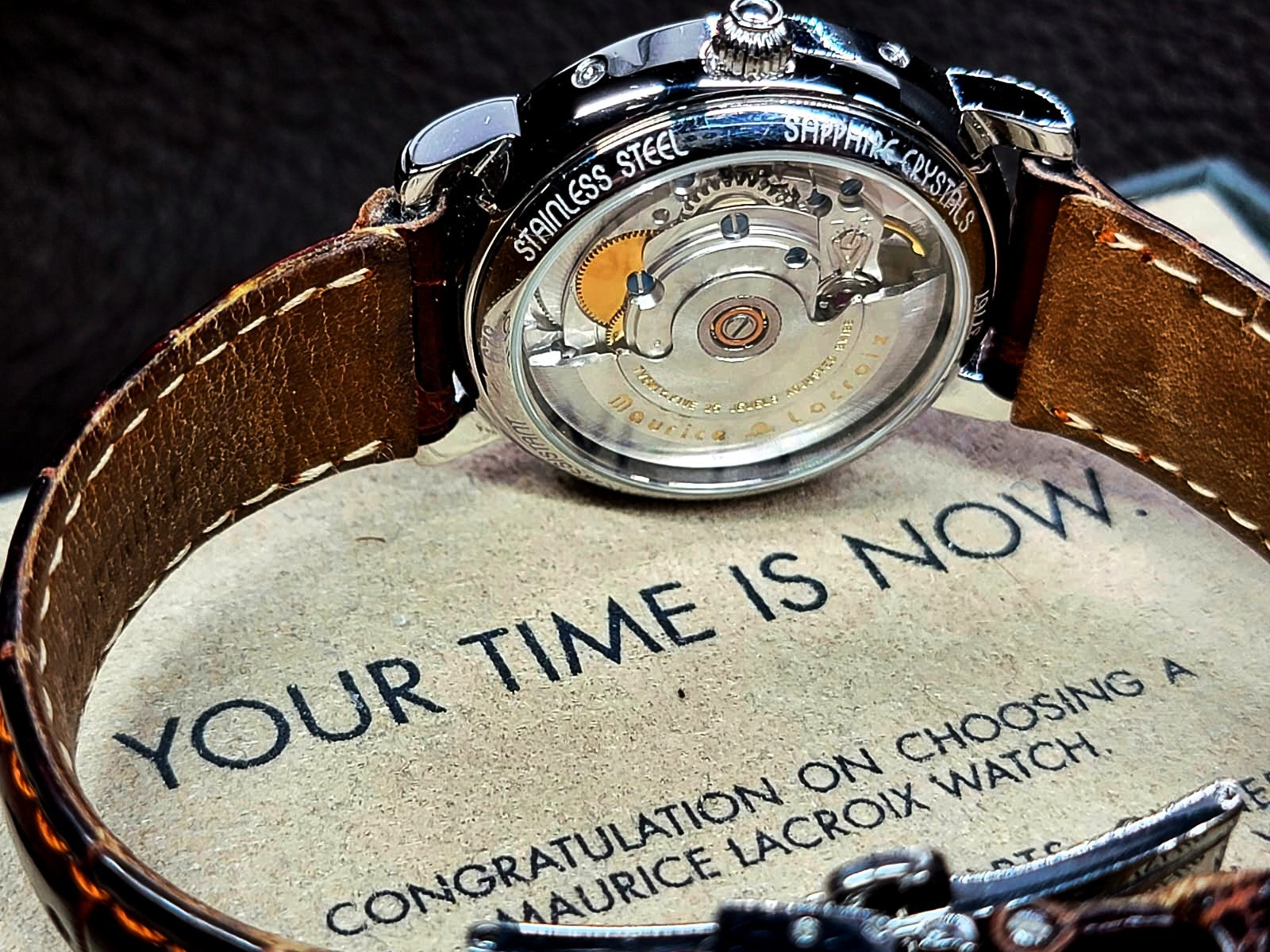This timepiece for its age is in very good condition, showing minimal signs of wear on the bezel, lugs, strap, case back, and clasp. This comes with a Maurice Display boxset.