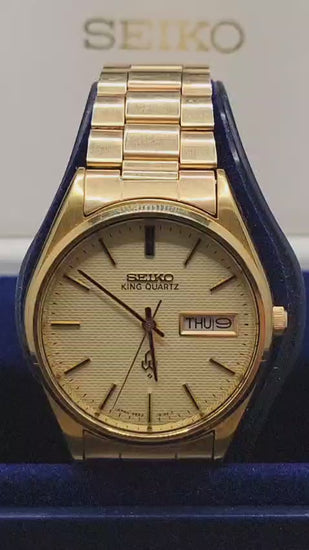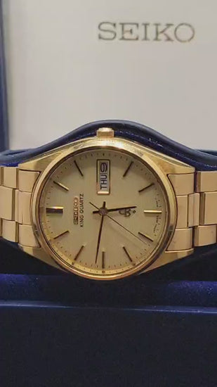 NEAR MINT 1976 GOLD SEIKO DAY DATE KING QUARTZ **SHIPPED FROM USA. This is a Commemorative Watch presented to Mr. Kazuo Kido to mark the occasion of him being awarded the Order of the Rising Sun, 5th Class, Gold and Silver Rays award on November 3, 1978 — a prestigious honor granted by the Japanese government. The Order of the Rising Sun, established in 1875 by Emperor Meiji, was Japan's first national decoration. It is awarded for "meritorious service to the state" in various fields, such as international relations, public service, and culture. The award is administered by the Decoration Bureau of the Cabinet Office and presented in the name of the emperor. While the Order itself is a medal and associated ribbon, it's common for a high-value gift like a commemorative watch to be presented to honor a significant achievement like receiving this prestigious award.