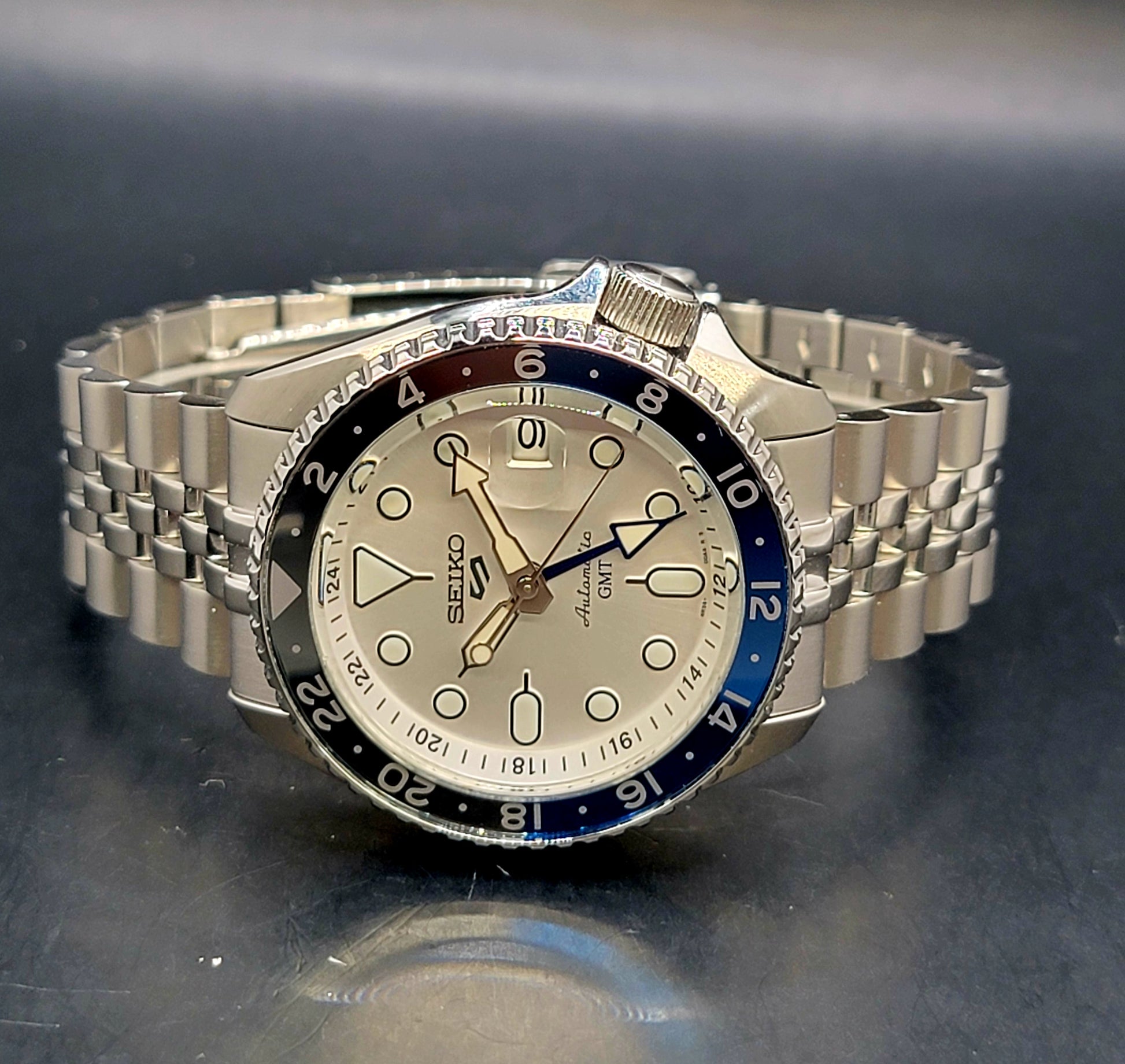 Seiko 5 Sports SKX Sports Style GMT Series. Adding new richness to classic sport/dress design, this dynamic watch offers a new variation on the popular “SKX” style. Equipped with automatic technology that you control with every movement, this versatile watch is powered by a 24-jewel movement that beats at a frequency of 21,600 vibrations per hour, with a power reserve of approximately 41 hours and manual winding capability. The silver dial features bold luminous hands and markers and a magnified date calendar, as well as a large blue GMT hand for instant visibility and is framed by a dramatic dual-tone blue and black GMT bezel. A stylized five-row stainless steel bracelet, with tri-fold push button release clasp and lock, adds rich texture and wearability, while the stainless steel case includes a screwdown see-through caseback for a view of classic timekeeping in action. 10 bar, 100M Water Resistant