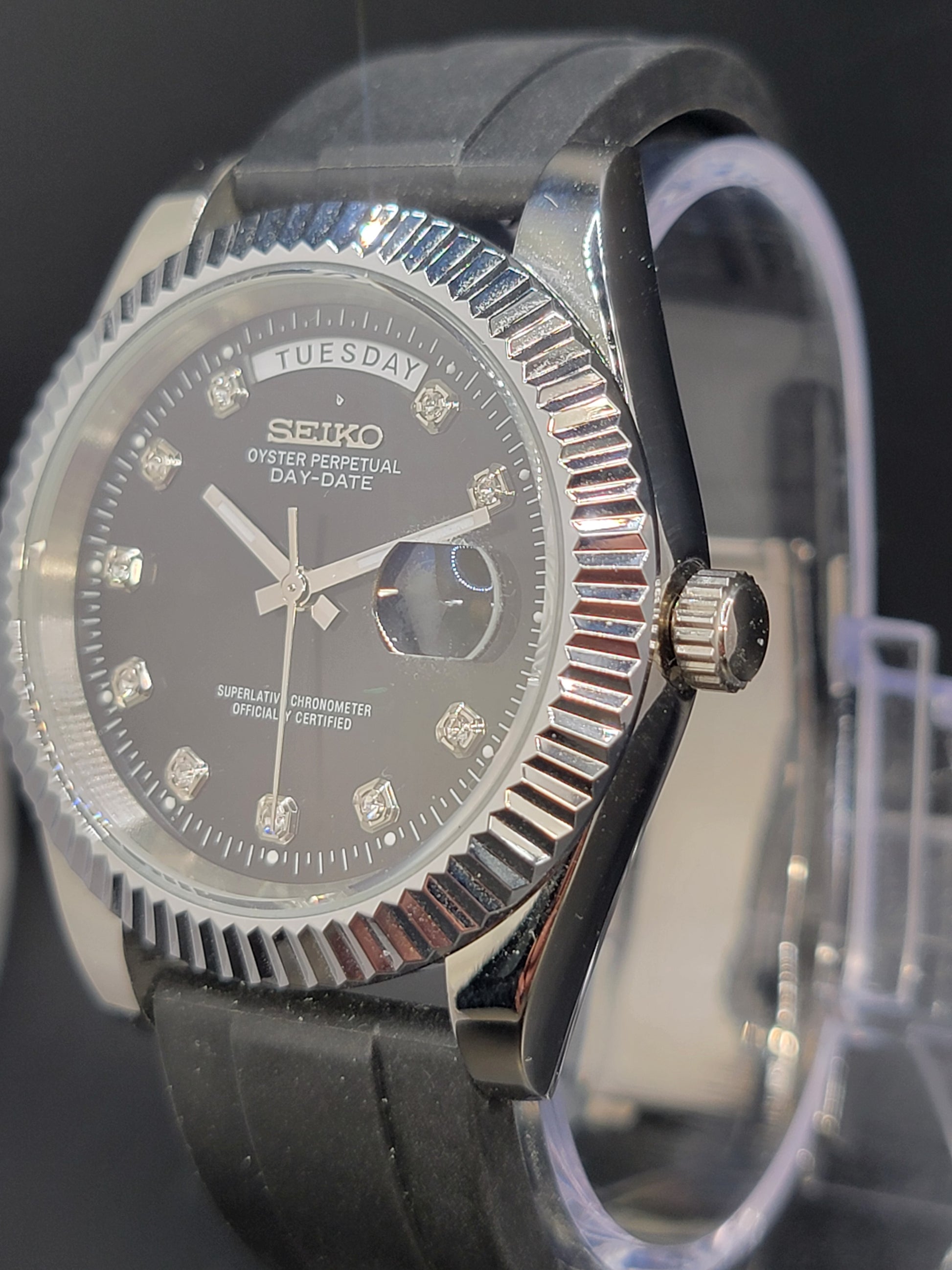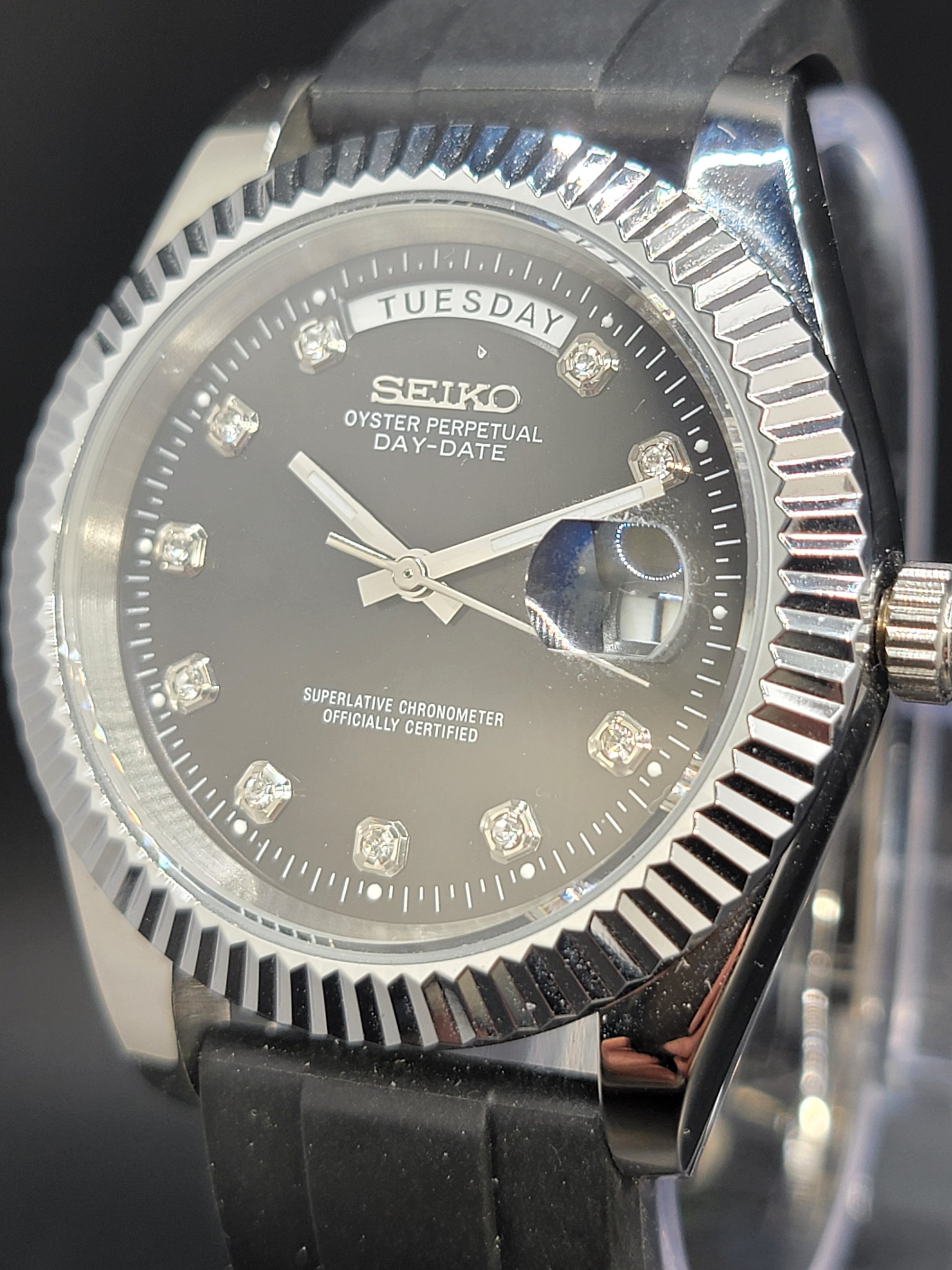 SEIKO DAYDATE MOD BLACK FACE WITH DIAMOND MARKERS AND RUBBER BAND