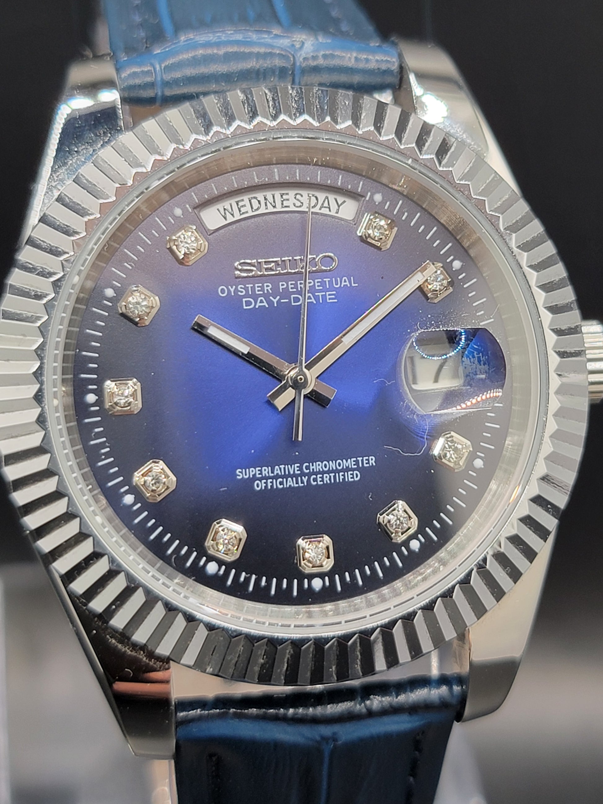 SEIKO DAYDATE MOD BLUE FACE WITH DIAMOND MARKERS AND LEATHER BAND