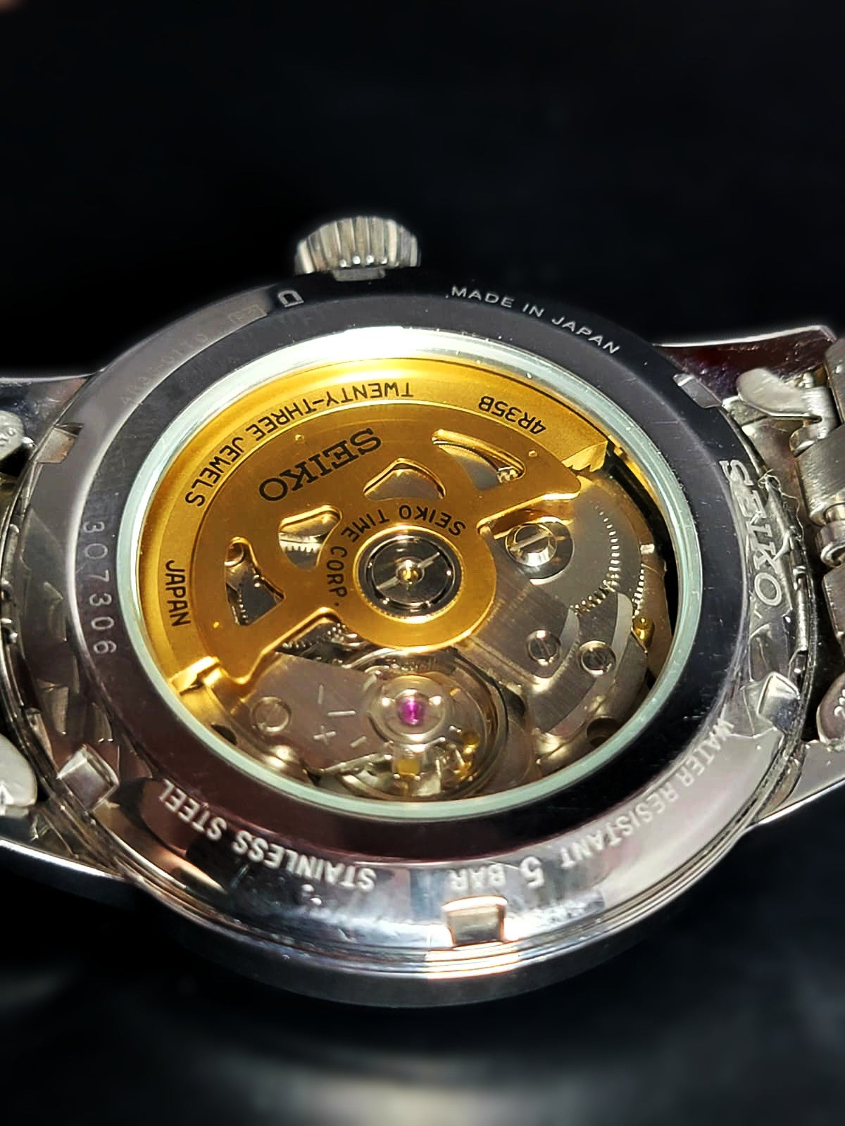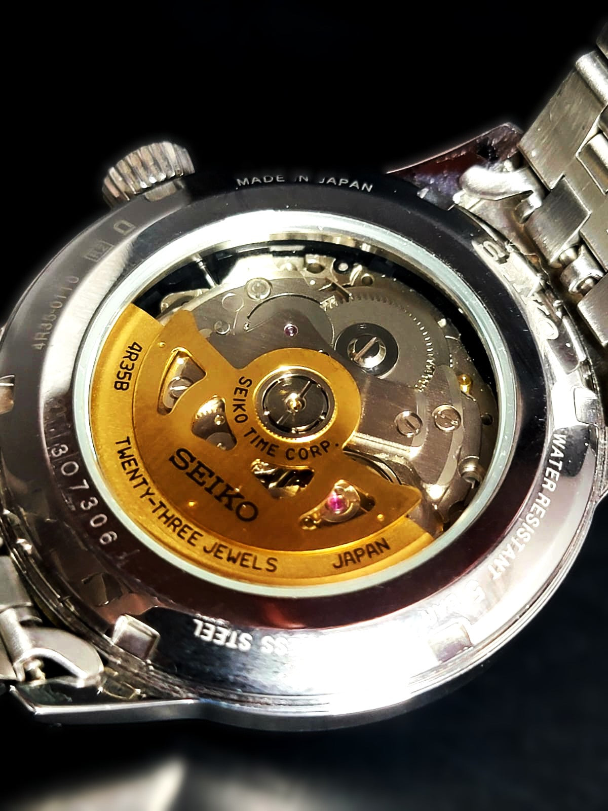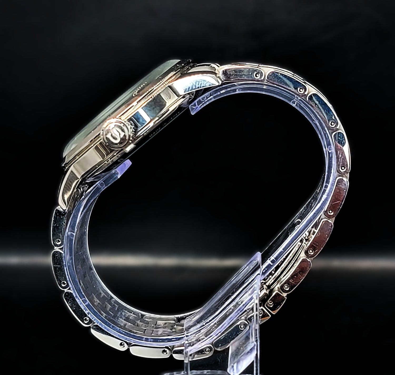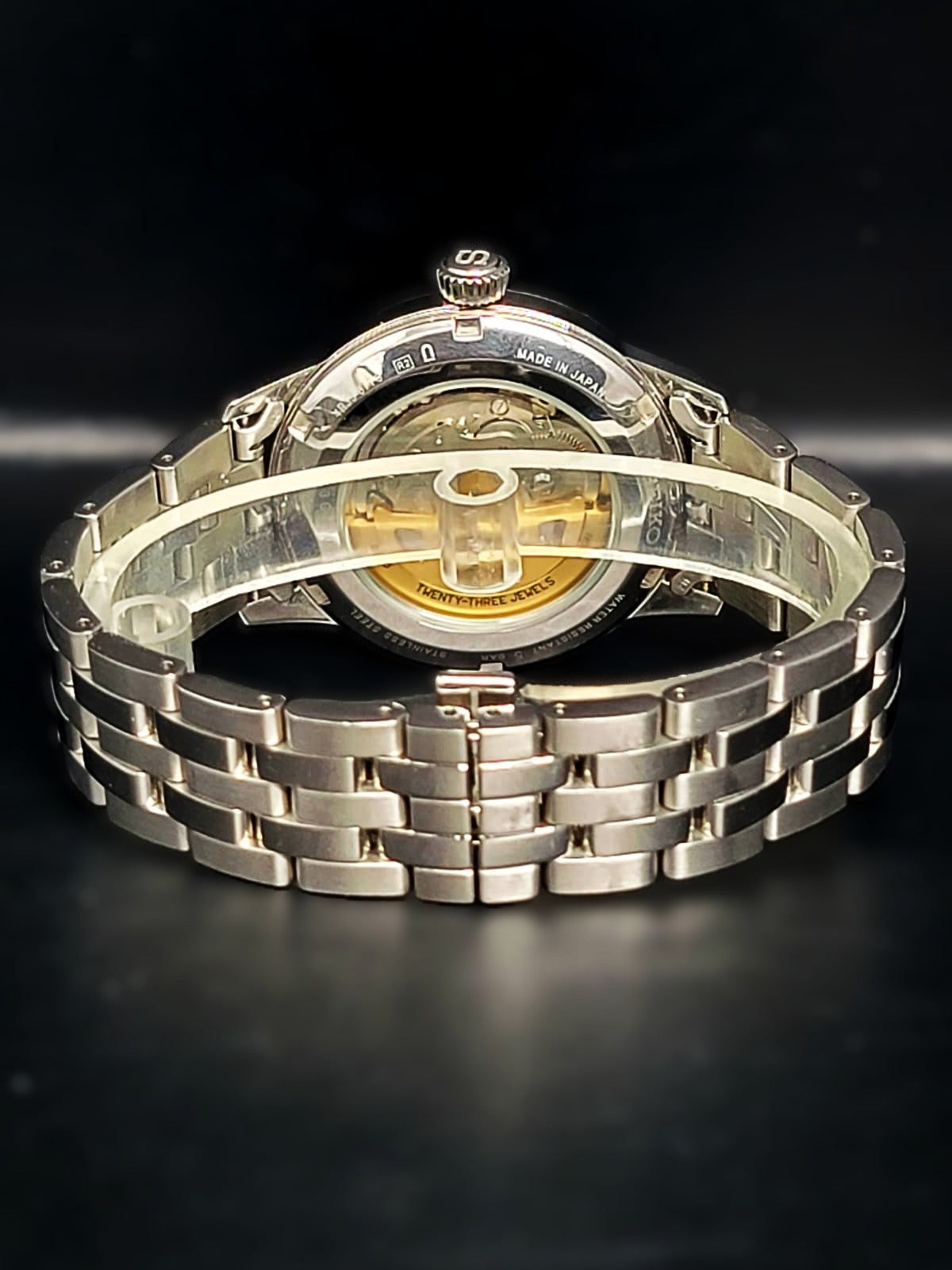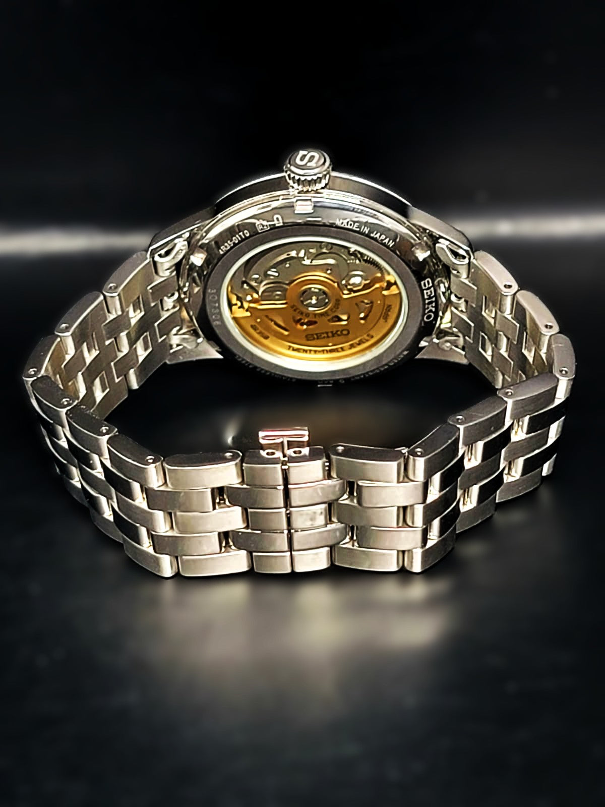 Stainless steel case with a stainless steel bracelet. Fixed stainless steel bezel. Silver dial with blue hands and index hour markers. Minute markers around the outer rim. Dial Type: Analog. Date display at the 3 o'clock position. Seiko caliber 4R35 automatic movement, containing 23 Jewels, bitting at 21600 vph, and has a power reserve of approximately 41 hours. Scratch resistant mineral crystal. Pull / push crown. Transparent case back. Round case shape. Case size: 40.5 mm. Case thickness: 12.7 mm. Band width: 22 mm. Fold over clasp with a push button release. Water resistant at 50 meters / 165 feet. Functions: date, hour, minute, second. Presage Series. Casual watch style. Seiko Presage Quartz Silver Dial Stainless Steel Men's Watch SRPB77.